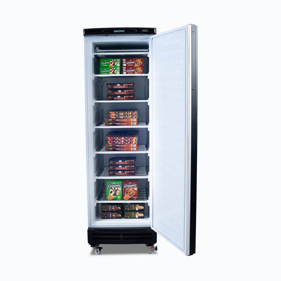 Our UF0374SDS-NR Upright Storage Freezer is the perfect back-of-house storage solution for smaller kitchens. With 6 fixed shelves plus a base, it offers ample storage space for your needs. The solid steel insluated exterior is designed to minimise heat ingress, ensuring optimal temperature maintenance inside the freezer while reducing energy consumption. Thanks to the natural refrigerant, you can enjoy efficient cooling with minimal energy usage. Refrigeration is integrated into all shelves, guaranteeing even cooling throughout. With lockable castors, you can easily move and position the freezer wherever it’s needed.